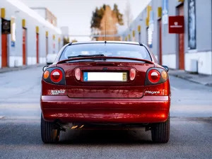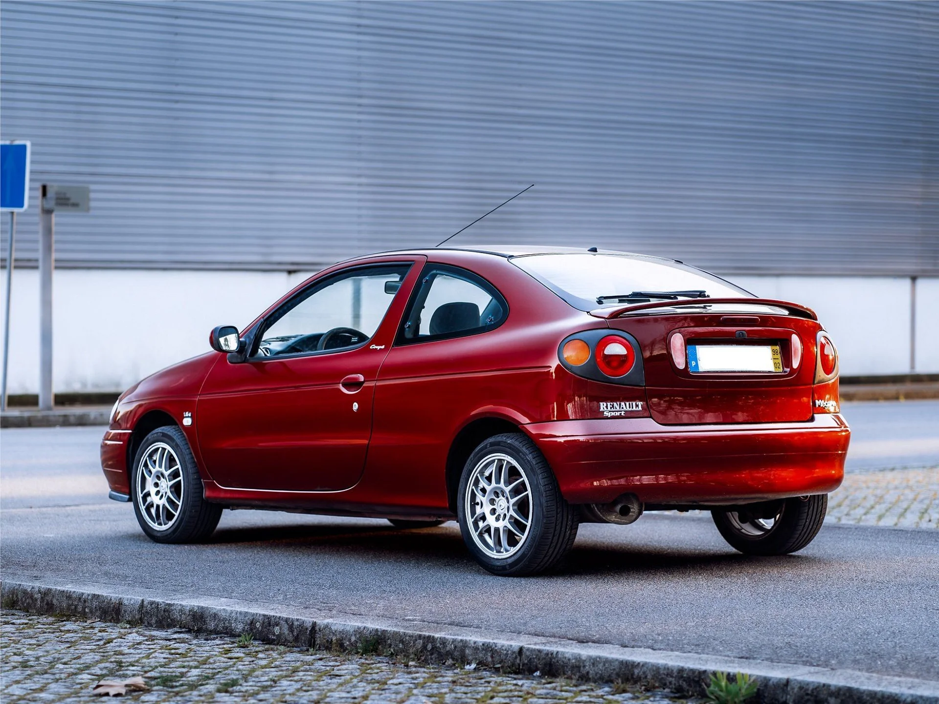 Renault Mégane na icónica carroçaria Coupé, com umas linhas elegantes e desportivas, realçadas pela cor. Este exemplar, sendo um 1.6e, está equipado com o motor K7M de quatro cilindros em linha e oito válvulas, capaz de produzir 90cv às 5.000rpm e 137Nm de binário às 4.000rpm, acoplado a uma caixa manual de cinco velocidades.